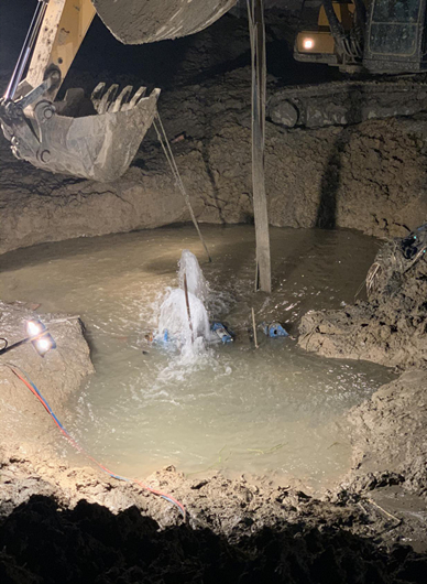 時間已經(jīng)過去了24小時,如果水再供應(yīng)不上,將會對郭村鎮(zhèn)正常生產(chǎn)生活秩序造成巨大影響。水務(wù)公司總經(jīng)理王智勇、龍泉公司經(jīng)理韓春暉、惠民公司經(jīng)理王永慶等領(lǐng)導(dǎo)立即啟動重大搶修工作一級響應(yīng),迅速趕赴現(xiàn)場,召開緊急會議,親自指導(dǎo),開展工作。一方面與鎮(zhèn)政府協(xié)調(diào)延長供水時間,調(diào)用應(yīng)急供水車,采用流動供水的方式緩解全鎮(zhèn)的供水壓力;另一方面研究搶修處置方案,經(jīng)過群策群力,最終確定了帶水作業(yè)的方案。一夜未眠的朱師傅再次穿上水下防護服,帶著其他搶修突擊隊員們進入工作坑,開始了艱難而緊張的搶修工作。