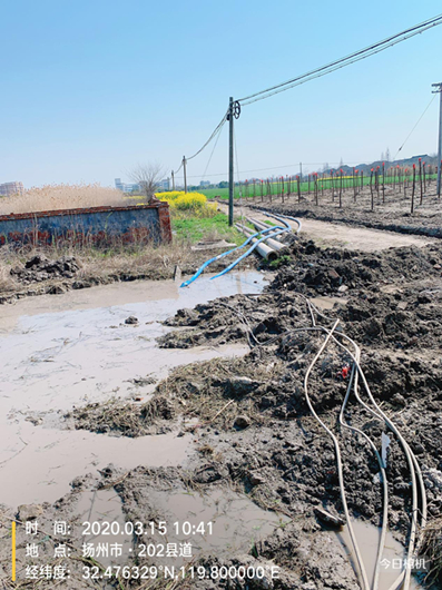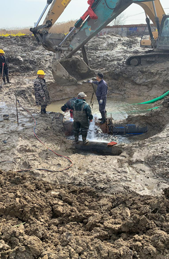 搶修就是命令,時間就是效率。根據(jù)公司主要領(lǐng)導(dǎo)安排,于2020年3月15日上午8點40分,朱忠東師傅、嚴慶章師傅等先后帶領(lǐng)我們維修人員、機具、物料進入現(xiàn)場作前期準備,一邊開挖工作坑,一邊抽水機抽水,采取歇人不歇機的辦法保證迅速挖出漏水口。由于農(nóng)田土質(zhì)松軟,再加上長時間被水浸泡,導(dǎo)致挖機多次陷入土中,嚴重影響了開挖進度。經(jīng)驗豐富的嚴師傅立即向指揮部反映,調(diào)來了一個大鋼板作為鋪墊,再將挖機置于鋼板上進行操作,順利解決了挖機塌陷的問題。經(jīng)過了兩個小時的開挖,漏水口終于顯現(xiàn)出來。朱師傅立即換上了“戰(zhàn)服”,“潛入”工作坑為搶修作準備。