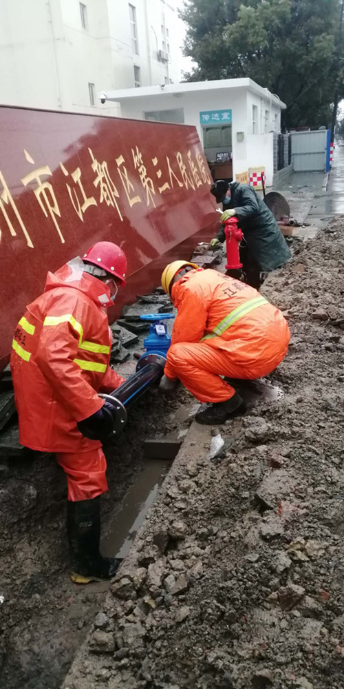 疫情就是命令,保供水就是責(zé)任。龍泉公司在接到緊急任務(wù)后,立即明確專人負(fù)責(zé),成立施工突擊隊,并迅速派人赴區(qū)第三人民醫(yī)院擴(kuò)建工程現(xiàn)場實地查勘,向院方詳細(xì)了解擴(kuò)建工程供水需求、施工進(jìn)度安排等,并與院方共同研究,現(xiàn)場確定擴(kuò)建工程的接水方案。2月15日上午,搶修人員佩戴口罩、安全帽,進(jìn)行了體溫測量,冒著雨雪趕赴現(xiàn)場,投入到緊張的施工工作中,由于前期施工方案細(xì)致、工作準(zhǔn)備充分,經(jīng)過10個小時的奮戰(zhàn),于當(dāng)天晚上8點順利完成了自來水管道的擴(kuò)建安裝任務(wù)。