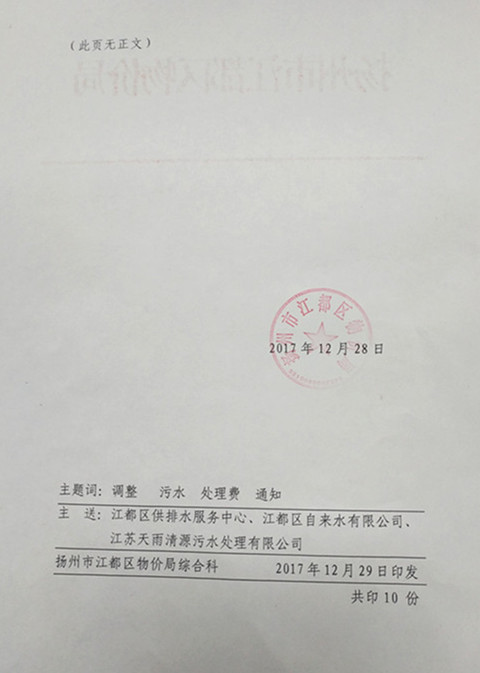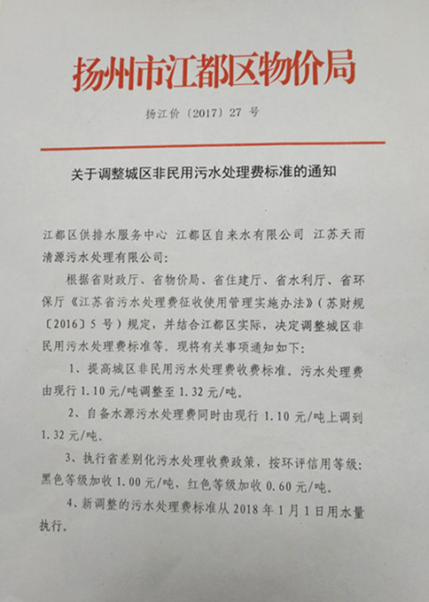 區物價局《關于調整城區非民用污水處理費標準的通知》