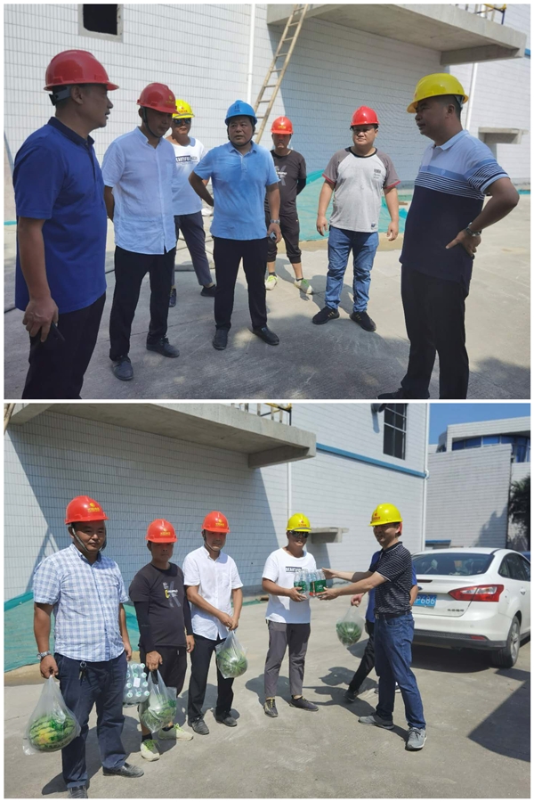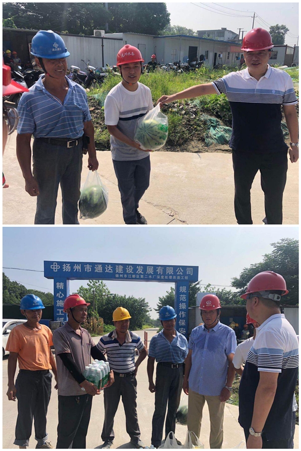 近日來,揚城開啟了“燒烤”模式,為做好高溫季節(jié)防暑降溫工作,切實保障廣大施工人員的安全健康,有效促進重點工程建設,8.18日上午,在龍川控股集團副總兼公司執(zhí)行董事張勇帶領下,集團與公司黨政工領導代表頂著酷暑,帶著慰問品來到二、三水廠深度處理改造工程項目施工現(xiàn)場,對在高溫下作業(yè)的建設者進行親切慰問。