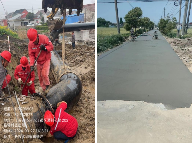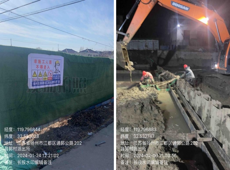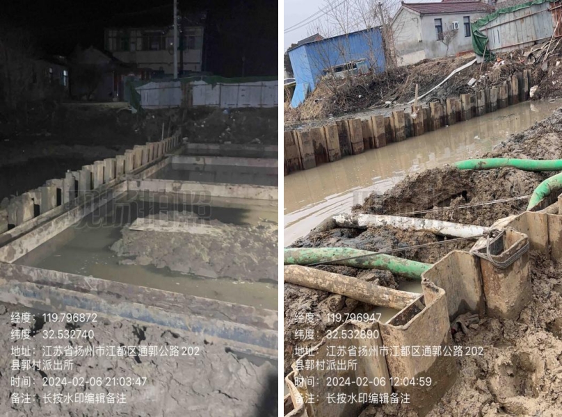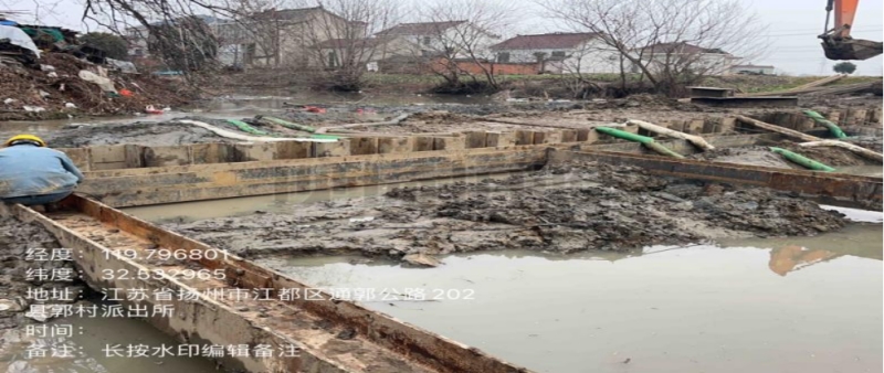 在施工過程中,東側(cè)原造橋壩頭設置過高,上游自來水漏水嚴重,挖機無法進場施工,人工拆除兩道壩頭。施工總體步驟:草袋圍堰支護,支護內(nèi)明排水,靜壓打樁,圍堰施工,開挖,管道維修,管道打壓,回填,鋼板樁拆除,圍堰拆除。