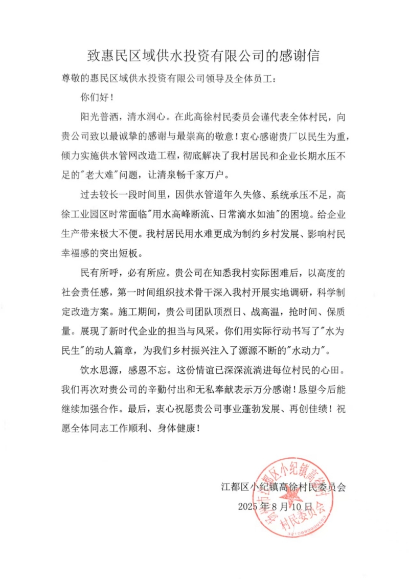 高徐村民委員會在感謝信中寫道:“施工期間,貴公司團(tuán)隊頂烈日、戰(zhàn)高溫,搶時間、保質(zhì)量。展現(xiàn)了新時代企業(yè)的擔(dān)當(dāng)與風(fēng)采。你們用實際行動書寫了水為民生的動人篇章,為我們鄉(xiāng)村振興注入了源源不斷的水動力。”