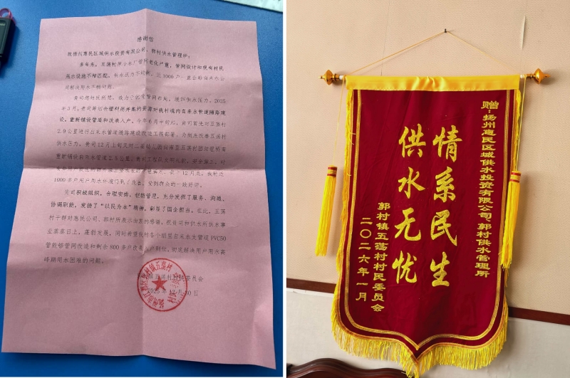 民有所呼,必有所應。惠民區(qū)域供水公司郭村供水管理所始終將群眾“急、難、愁、盼”放在首位,主動扛起供水保障政治責任與民生擔當,以實干實效回應群眾期盼。2025年3月,公司統(tǒng)籌規(guī)劃、集約資源,啟動五蕩村自來水管道隨路建設工程,重新鋪設管道和改表入戶。6月中旬起,惠民區(qū)域供水公司率先完成村內(nèi)2.9公里自來水主管道改造;12月上旬,為進一步提升供水壓力,惠民區(qū)域供水公司又對二姜幼兒園向南至團結(jié)組橋南的2.5公里自來水主管道進行重新鋪設。截至2025年12月底,五蕩村近1000戶村民的用水環(huán)境得到顯著改善,“用水難”問題得到有效緩解。五蕩村在感謝信中表示,惠民區(qū)域供水公司郭村供水管理所積極組織、合理安排、創(chuàng)新管理,充分發(fā)揮服務、溝通、協(xié)調(diào)職能,發(fā)揚“以民為本”精神,彰顯了國企擔當。同時,村民也熱切期盼,后續(xù)各組PVC50自來水支管改造及剩余800余戶改表入戶工作能夠加快推進,徹底破解高峰期用水瓶頸,真正實現(xiàn)全域供水全覆蓋、全保障、全無憂。